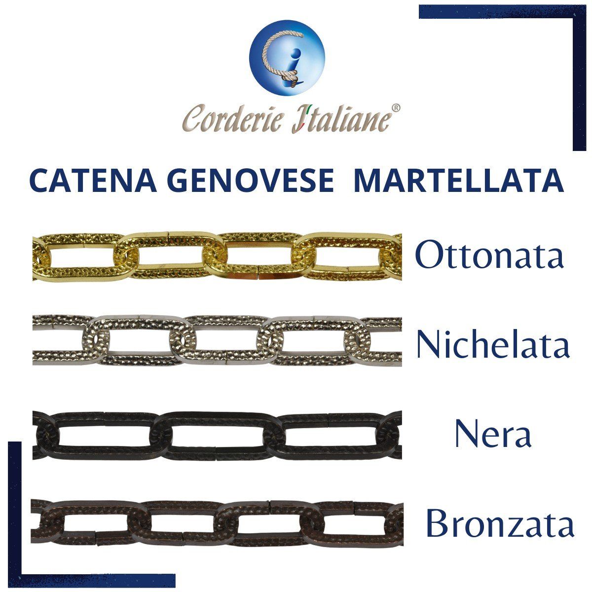 Catena genovese a filo quadro martellato. Materiale: ferro con finitura nera. Indicata per usi domestici, decorativi e artigianali. Evitare di superare il carico massimo di rottura. Prodotto 100% Made in Italy.