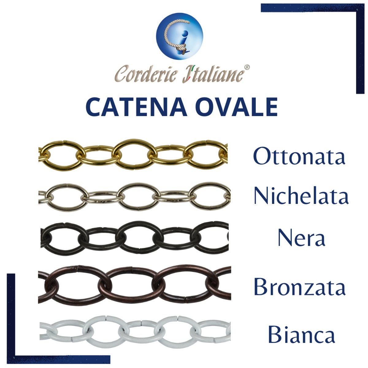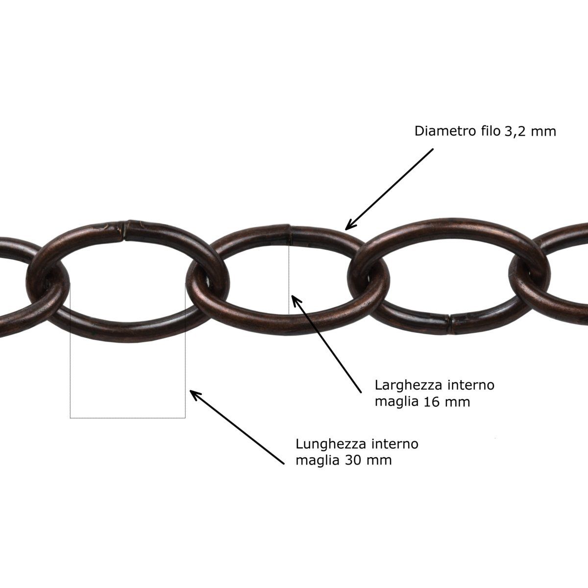 Catena ovale in ferro, finitura bronzata. Indicata per usi domestici, decorativi e artigianali. Evitare di superare il carico massimo di rottura. Prodotto 100% Made in Italy.