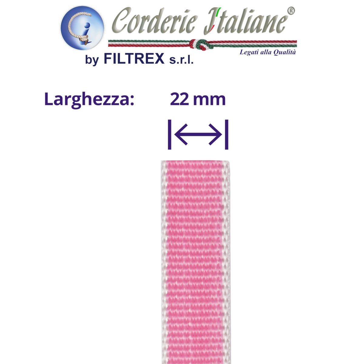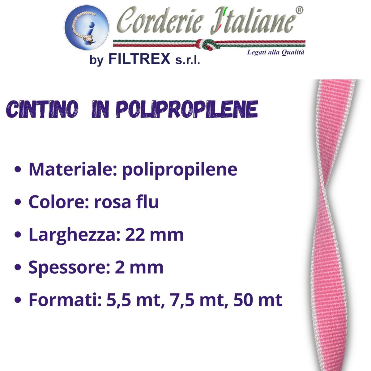 Cintino in polipropilene per tapparelle. Rotolo da 50 mt, (per uso professionale), con larghezza pari a 22 mm, di colore rosa flu. Realizzato mediante tessitura su telaio meccanico, con materiali di prima scelta. Prodotto di qualità e 100% Made in Italy.