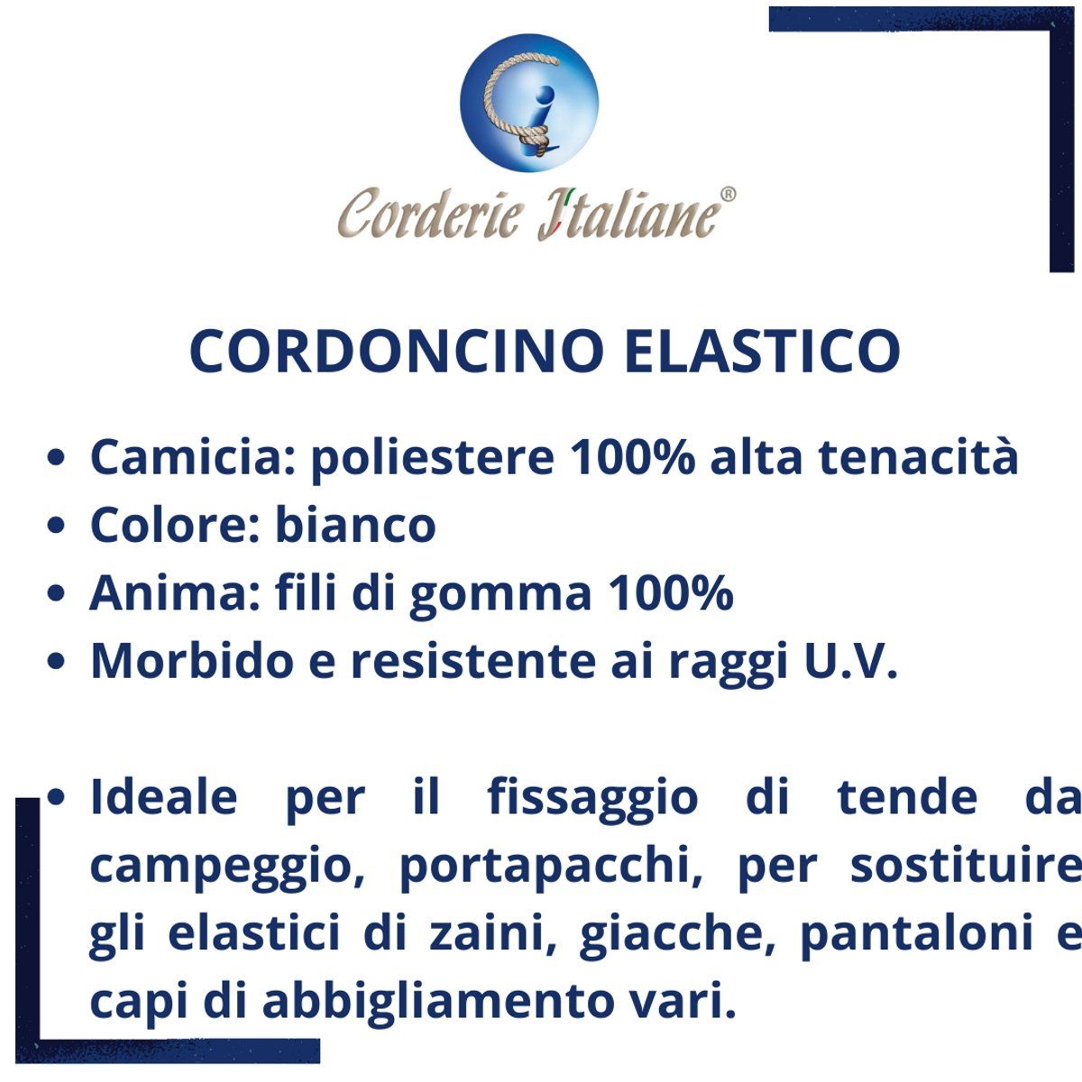 Cordoncino elastico costituito da calza in poliestere alta tenacità e anima interna in multifili di lattice vergine. Trova applicazione nel settore moda, accessori, abbigliamento e fai da te. Morbido, elastico e resistente, grazie ai filati di prima scelta utilizzati per la sua realizzazione. Ideale per sostituire i legacci di giubbotti e giacchetti, borsine e capi vari. Dopo il taglio, si consiglia una saldatura a caldo del solo rivestimento per evitare che si sfilacci. Prodotto di primissima qualità e 100% Made in Italy.