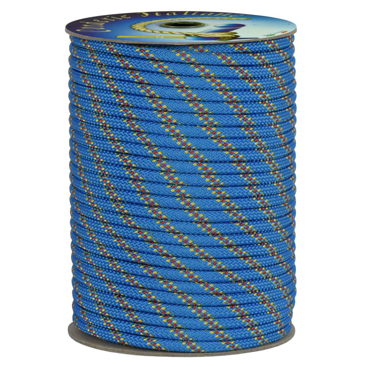 Doppia treccia in poliestere 100% prestirato alta tenacità, colore azzurro con spia gialla/rossa/gialla. Calza esterna e anima interna realizzate interamente con fibra di poliestere 100% alta tenacità. Viene utilizzata per issare o ammainare la vela sulle imbarcazioni. Si contraddistingue per un ridottissimo allungamento e un'elevata resistenza all'abrasione. Si asciuga velocemente e mostra una resistenza notevole alla lunga esposizione ai raggi UV. Si consiglia una saldatura a caldo dopo il taglio.