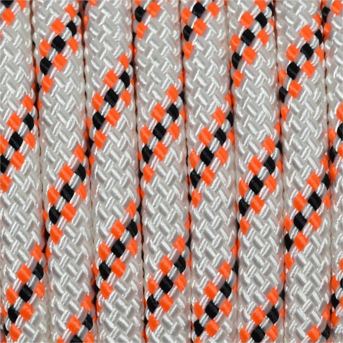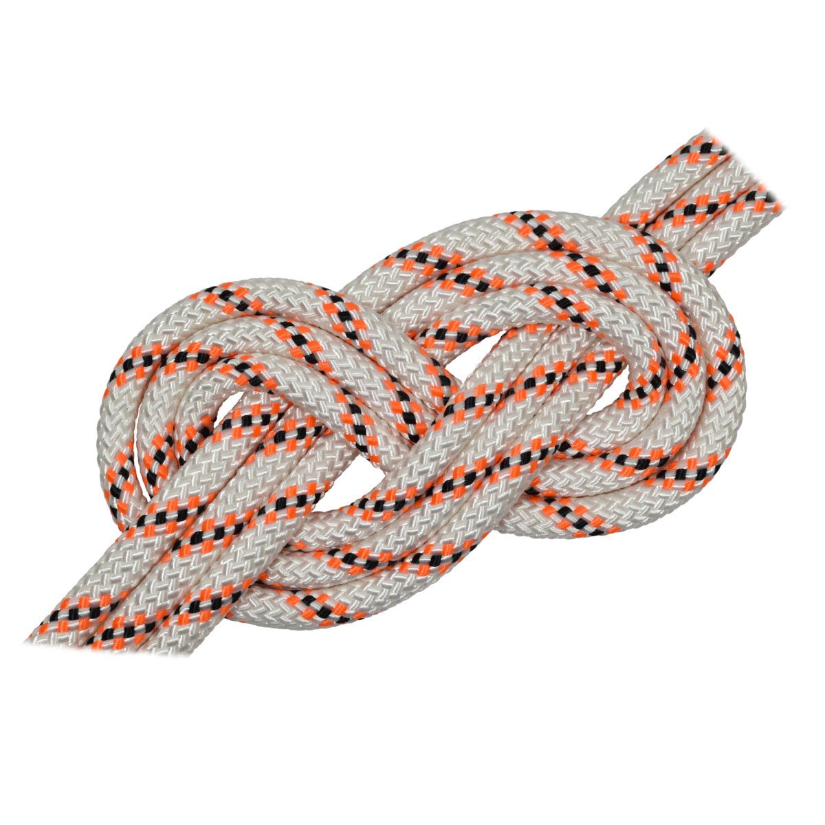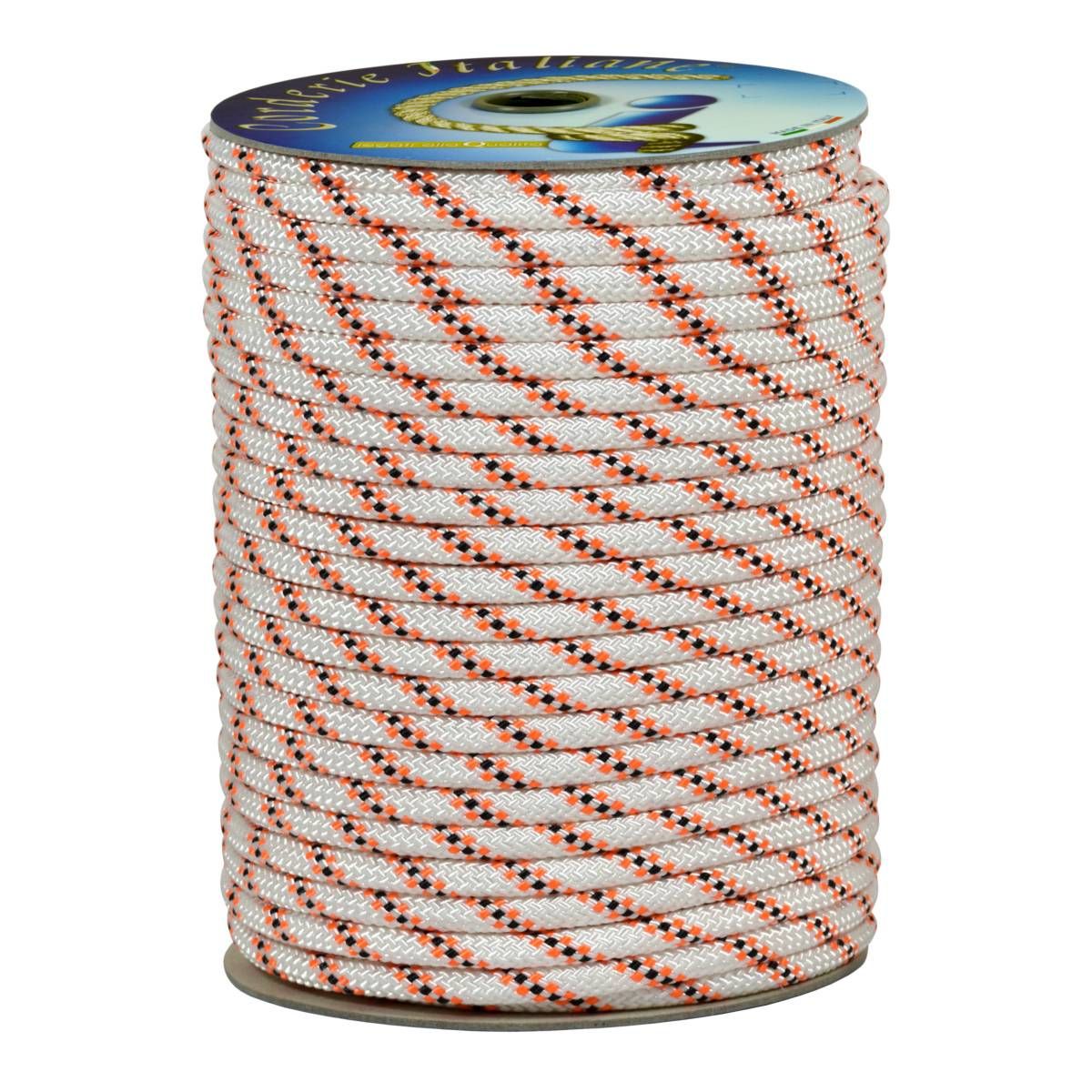 Doppia treccia in poliestere 100% prestirato alta tenacità, colore bianco con spia arancio/nero/arancio. Calza esterna e anima interna realizzate interamente con fibra di poliestere 100% alta tenacità. Viene utilizzata per issare o ammainare la vela sulle imbarcazioni. Si contraddistingue per un ridottissimo allungamento e un'elevata resistenza all'abrasione. Si asciuga velocemente e mostra una resistenza notevole alla lunga esposizione ai raggi UV. Si consiglia una saldatura a caldo dopo il taglio.