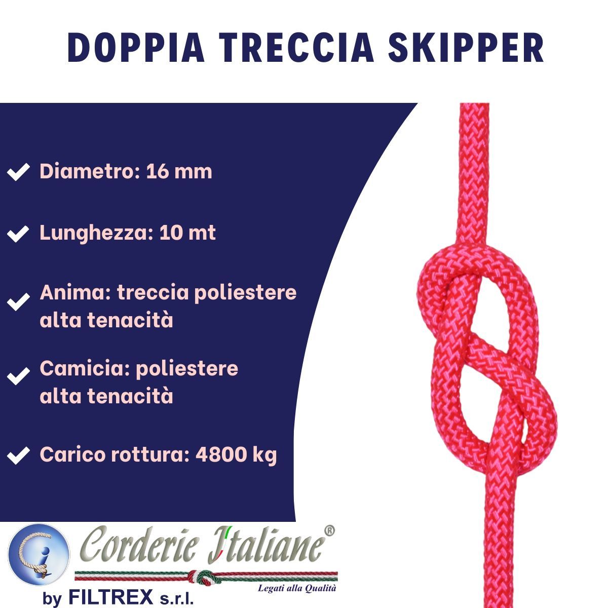 Doppia treccia in poliestere 100% prestirato alta tenacità, colore rosa flu. Calza esterna e anima interna realizzate interamente con fibra di poliestere 100% alta tenacità. Viene utilizzata per issare o ammainare la vela sulle imbarcazioni. Si contraddistingue per un ridottissimo allungamento e un'elevata resistenza all'abrasione. Si asciuga velocemente e mostra una resistenza notevole alla lunga esposizione ai raggi UV. Si consiglia una saldatura a caldo dopo il taglio.