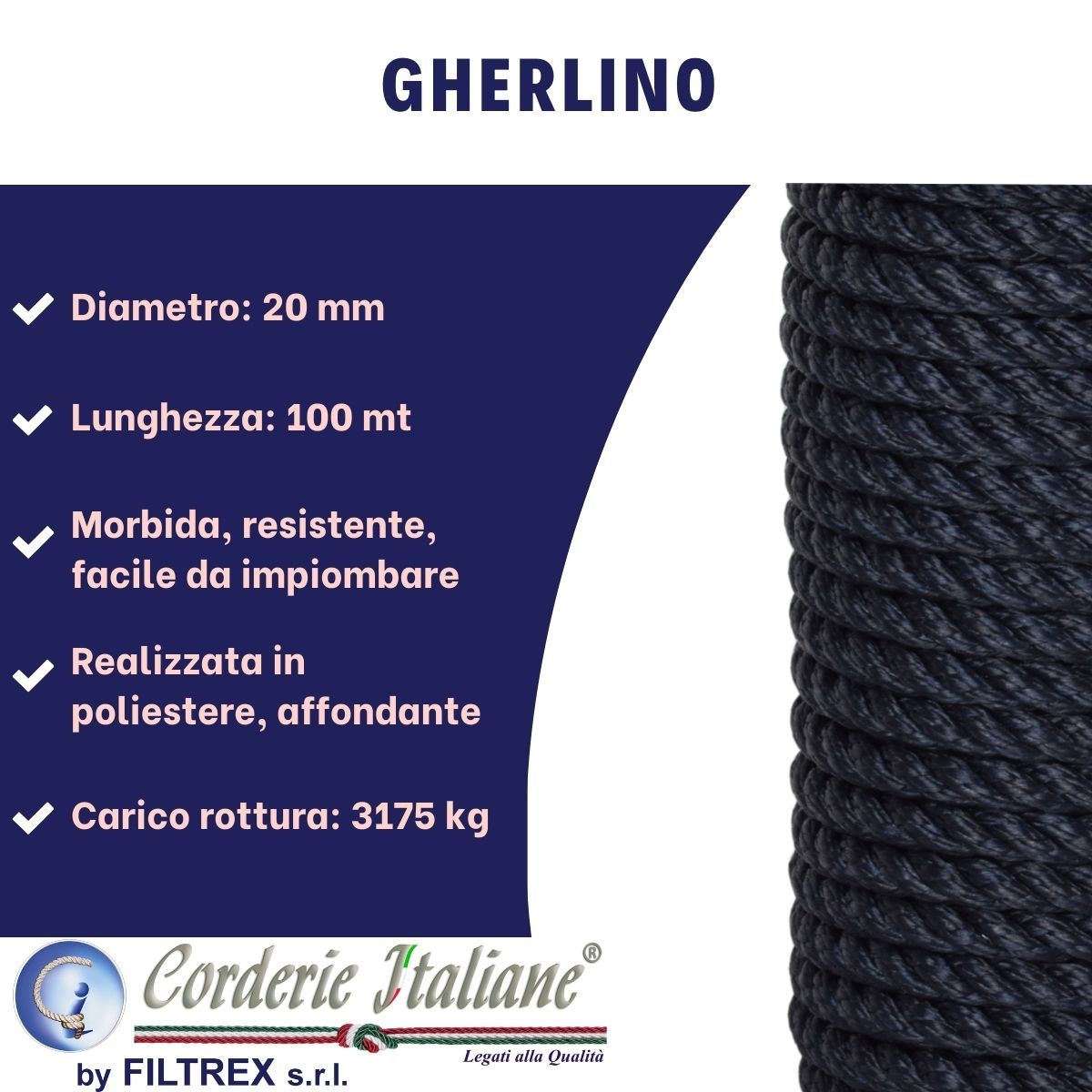 Il gherlino è una cima in poliestere resistente e flessibile, ideale per ormeggi, legature e fissaggi su barche o stand. Maneggevole e durevole, resiste a sole, salsedine e umidità, garantendo sicurezza e versatilità in ogni utilizzo. Prodotto 100% Made in Italy.