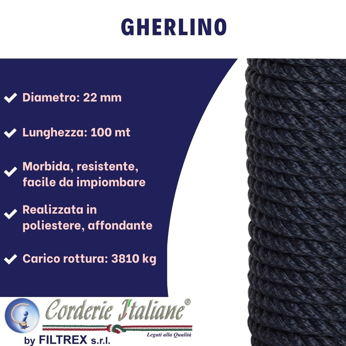 Il gherlino è una cima in poliestere resistente e flessibile, ideale per ormeggi, legature e fissaggi su barche o stand. Maneggevole e durevole, resiste a sole, salsedine e umidità, garantendo sicurezza e versatilità in ogni utilizzo. Prodotto 100% Made in Italy.