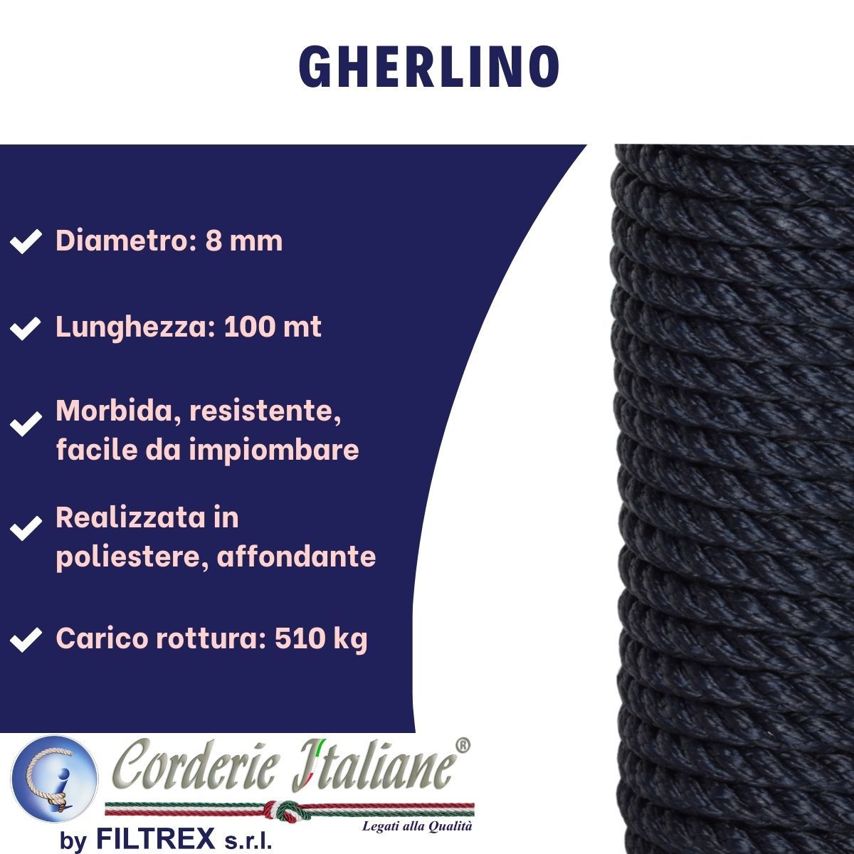 Il gherlino è una cima in poliestere resistente e flessibile, ideale per ormeggi, legature e fissaggi su barche o stand. Maneggevole e durevole, resiste a sole, salsedine e umidità, garantendo sicurezza e versatilità in ogni utilizzo. Prodotto 100% Made in Italy.