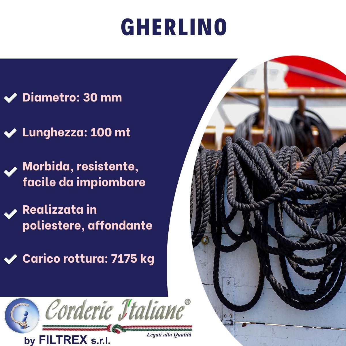 Il gherlino è una cima in poliestere resistente e flessibile, ideale per ormeggi, legature e fissaggi su barche o stand. Maneggevole e durevole, resiste a sole, salsedine e umidità, garantendo sicurezza e versatilità in ogni utilizzo. Prodotto 100% Made in Italy.