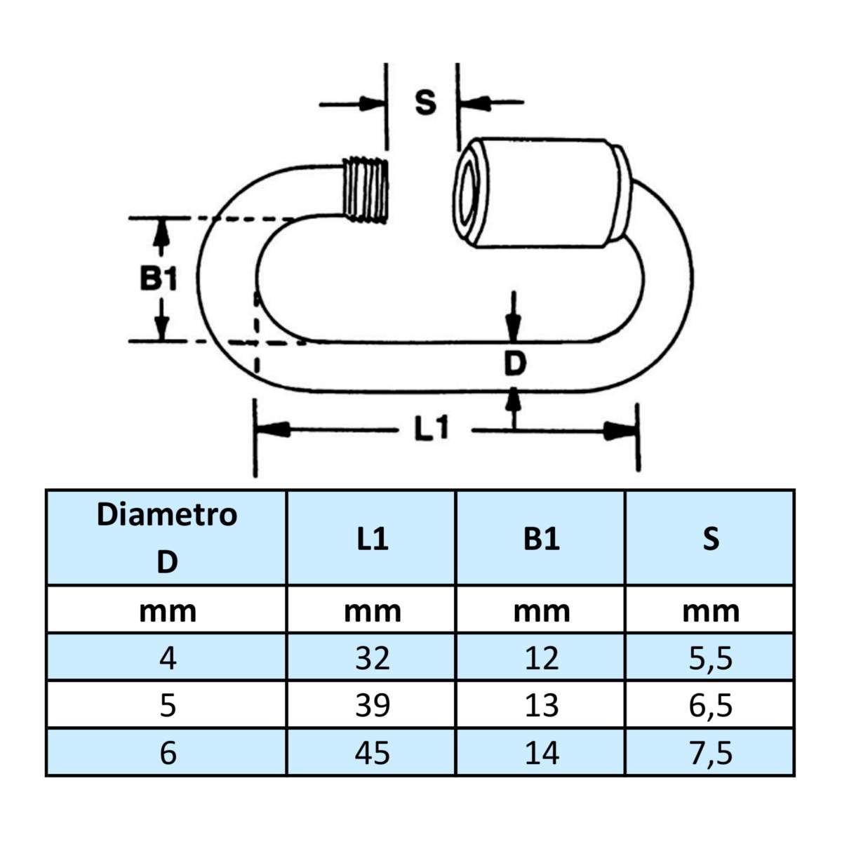 Maglia rapida in acciaio inox 316. Utilizzato per l'aggancio sicuro di cavi, funi e catene.