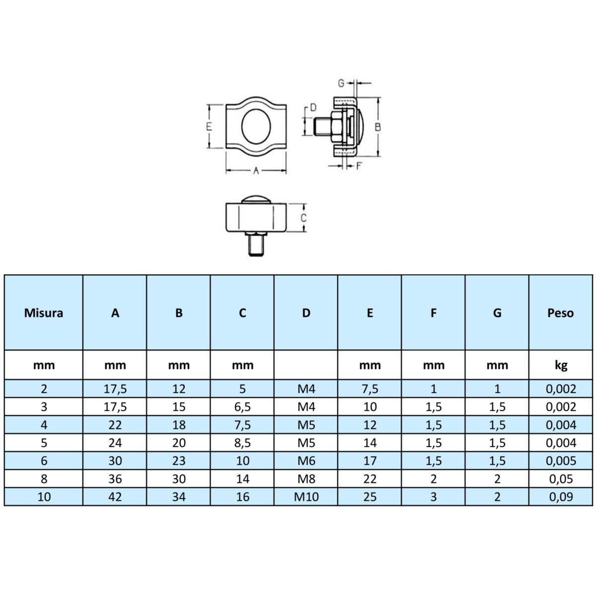 Morsetto Simplex realizzato interamente in acciaio zincato FE 360 B. Viene generalmente utilizzato per creare delle asole su funi e cavi di acciaio nel settore nautico, agricolo e industriale. Si sconsiglia l'utilizzo per carichi particolarmente gravosi e per funi tessili.