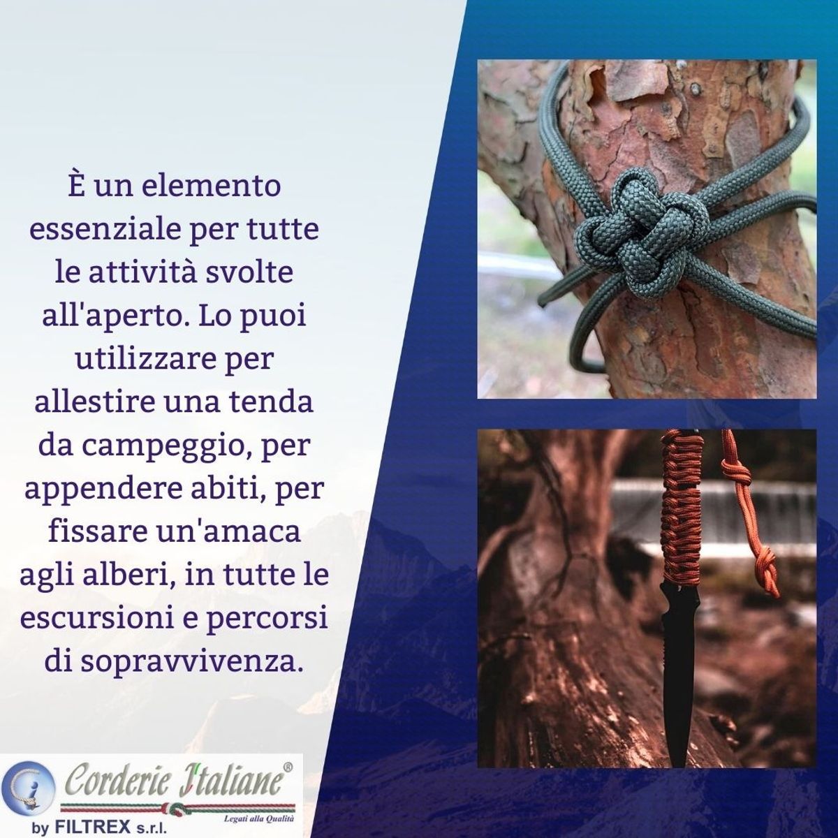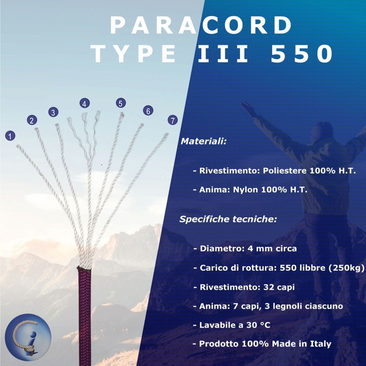 Il Paracord è una cordino originariamente utilizzato nella progettazione dei paracadute durante la seconda guerra mondiale. Da qui l'origine del suo nome. I soldati venivano lanciati dietro le linee nemiche e, una volta abbandonato il paracadute perché ingombrante, recuperavano il cordino affinché potesse essere utilizzato in tutte le circostanze. Fu così che emersero le sue incredibili qualità: leggero, resistente alle intemperie, ai raggi U.V., all’usura e allo sfregamento. Si rivelò un eccellente strumento per legare e trasportare rami per il fuoco, per costruire un riparo, per steccare un arto ferito, per preparare trappole per animali o nemici. Ha un carico di rottura di 250 kg, e questo lo rende un cordino adatto per qualunque tipo di attività outdoor: campeggio, percorsi di sopravvivenza ed escursioni di vario tipo.