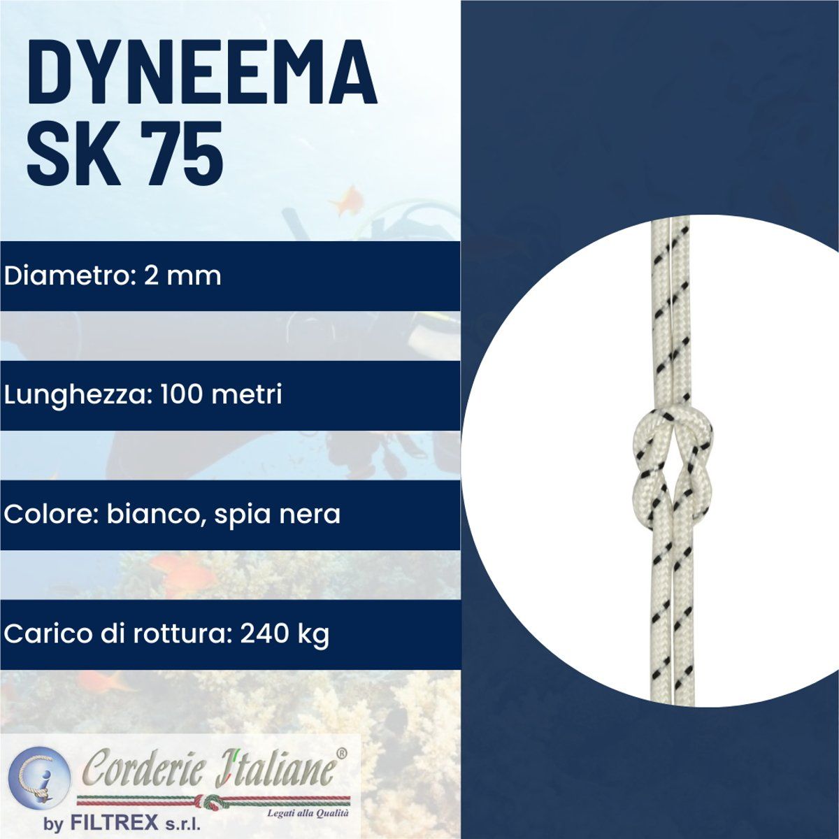 Sagola tecnica per fucili da sub. Si tratta di una doppia treccia, la cui anima è realizzata in 100% Dyneema SK75 intrecciato. Rivestimento in poliestere 100% alta tenacità prestirato e stabilizzato ai raggi UV.