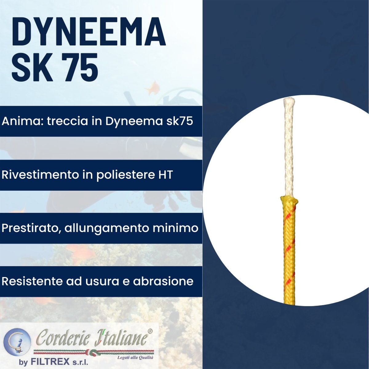 Sagola tecnica per fucili da sub. Si tratta di una doppia treccia, la cui anima è realizzata in 100% Dyneema SK75 intrecciato. Rivestimento in poliestere 100% alta tenacità prestirato e stabilizzato ai raggi UV.