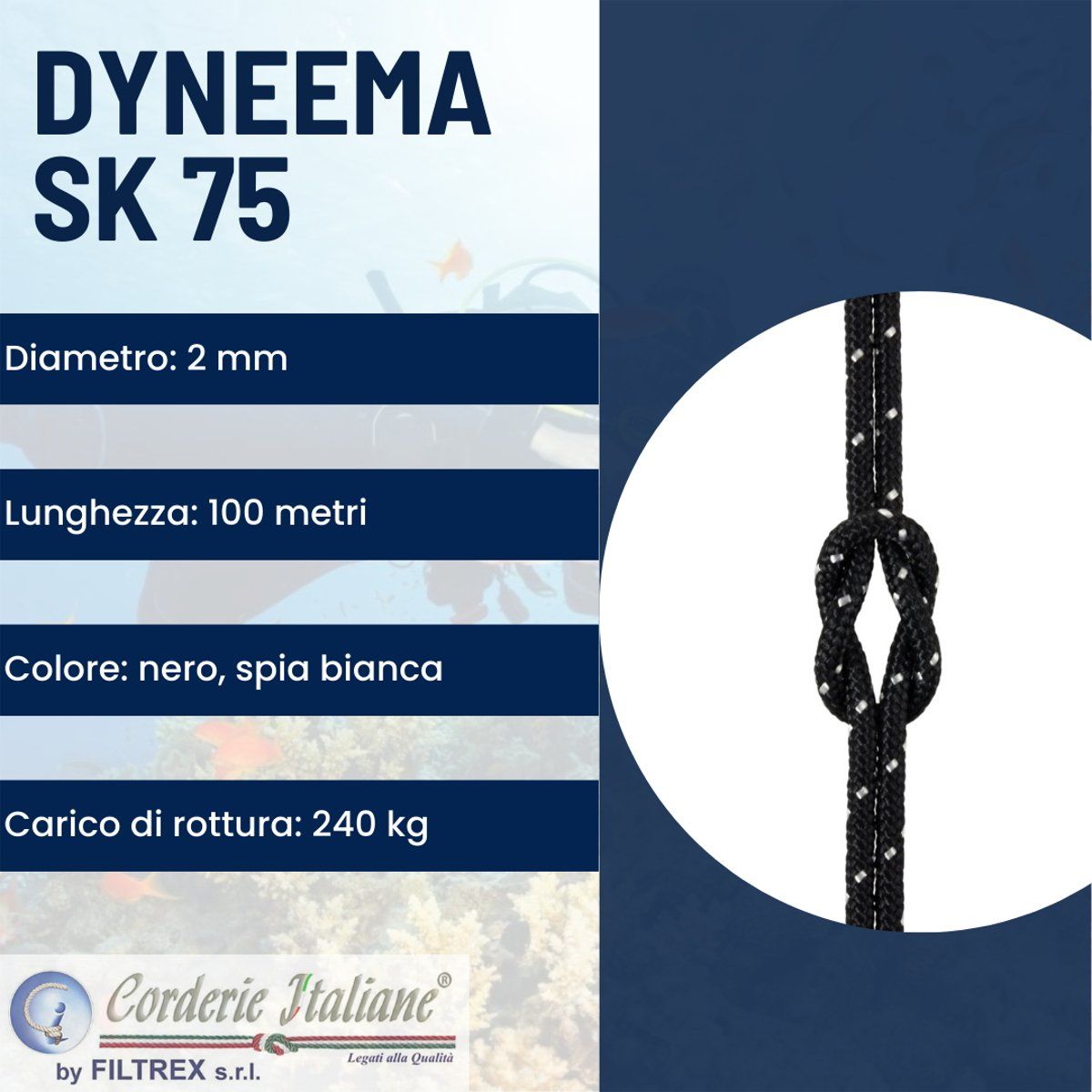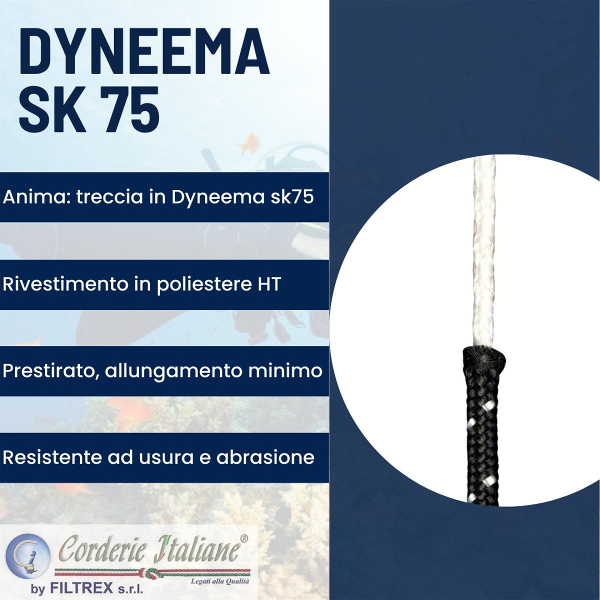 Sagola tecnica per fucili da sub. Si tratta di una doppia treccia, la cui anima è realizzata in 100% Dyneema SK75 intrecciato. Rivestimento in poliestere 100% alta tenacità prestirato e stabilizzato ai raggi UV.