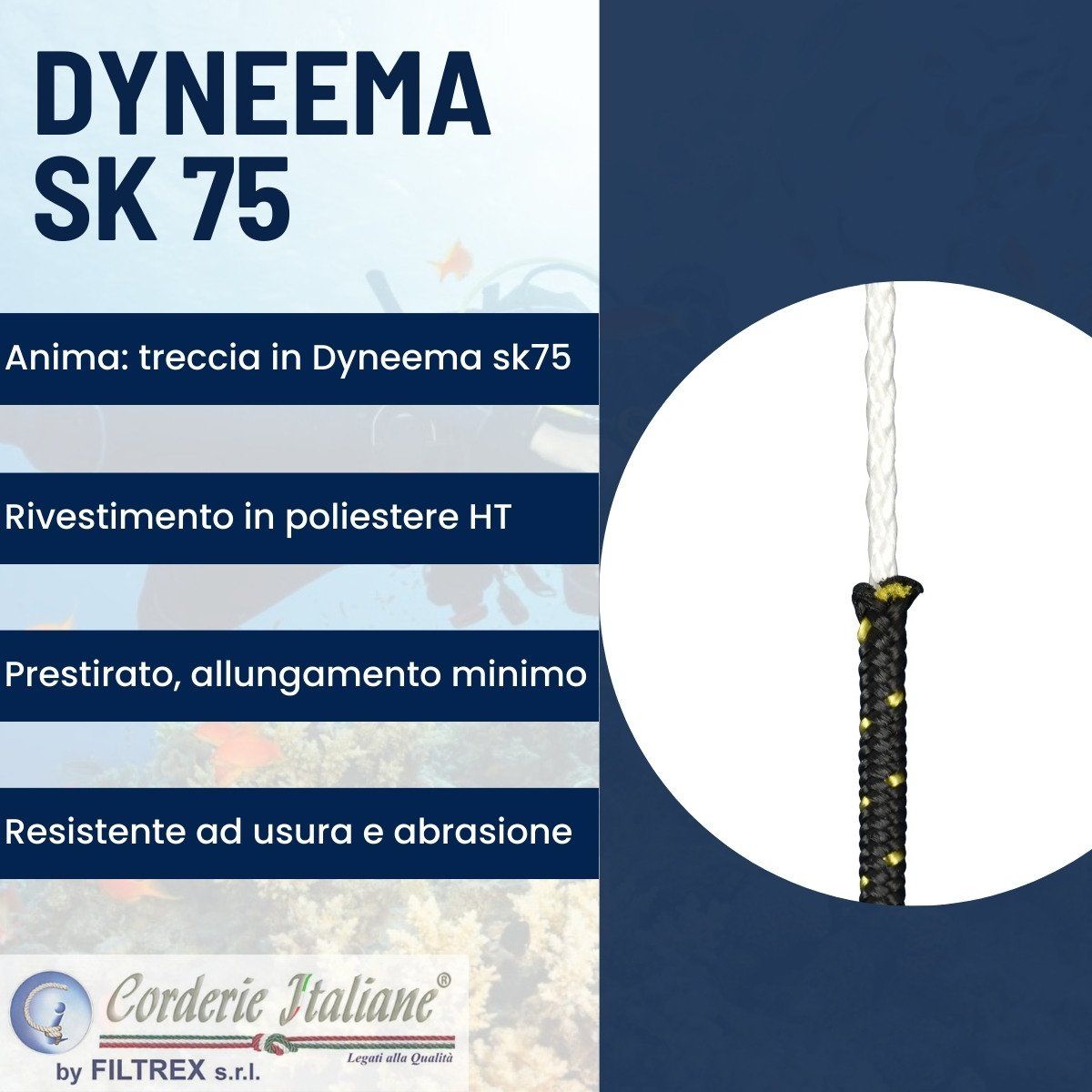 Sagola tecnica per fucili da sub. Si tratta di una doppia treccia, la cui anima è realizzata in 100% Dyneema SK75 intrecciato. Rivestimento in poliestere 100% alta tenacità prestirato e stabilizzato ai raggi UV.