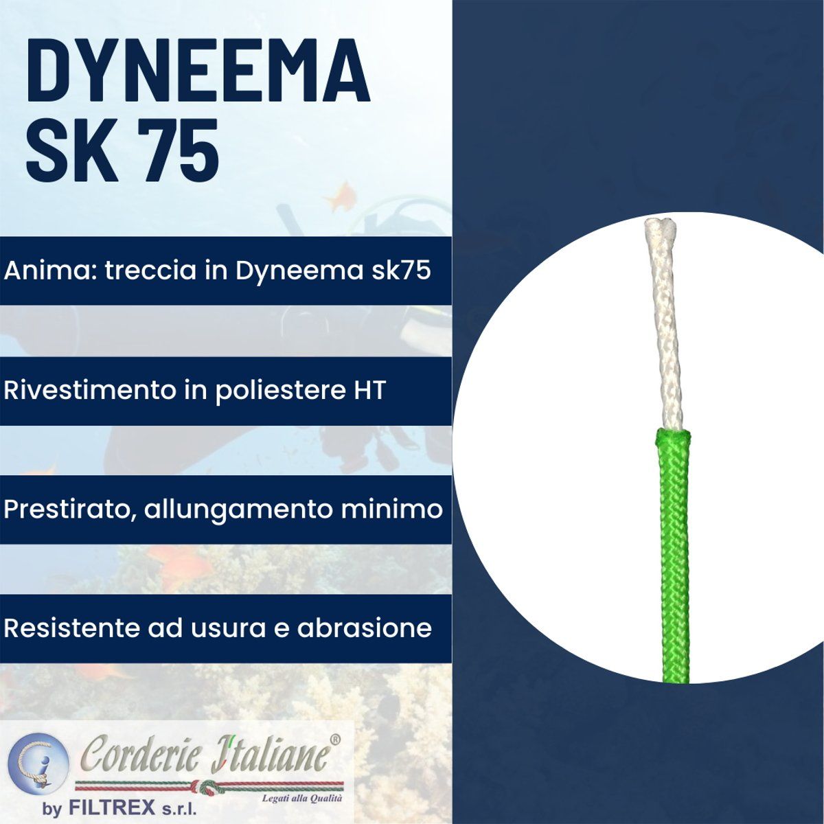 Sagola tecnica per fucili da sub. Si tratta di una doppia treccia, la cui anima è realizzata in 100% Dyneema SK75 intrecciato. Rivestimento in poliestere 100% alta tenacità prestirato e stabilizzato ai raggi UV.