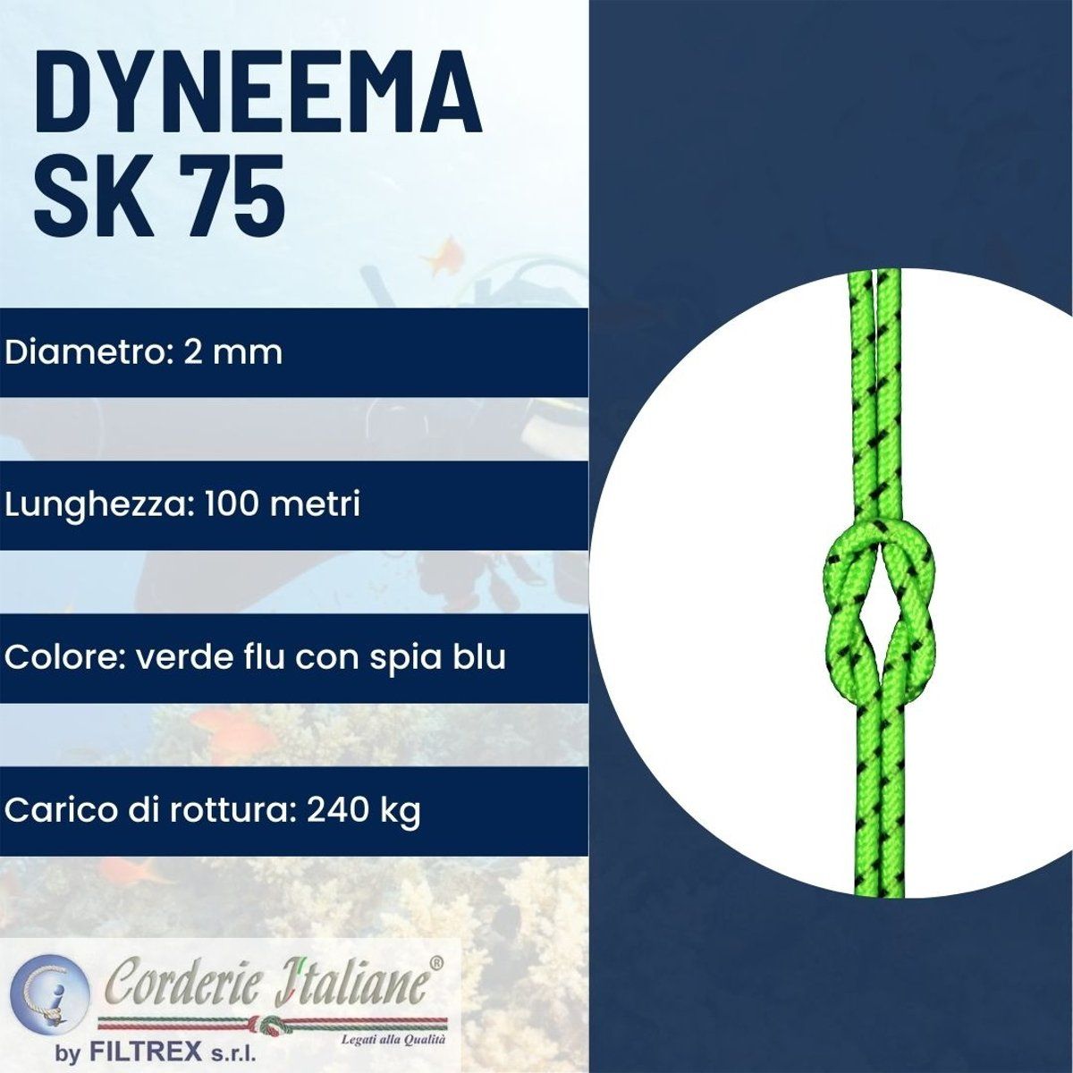 Sagola dyneema sk75 per fucili da sub, verde flu/blu, 2 mm - 100 mt