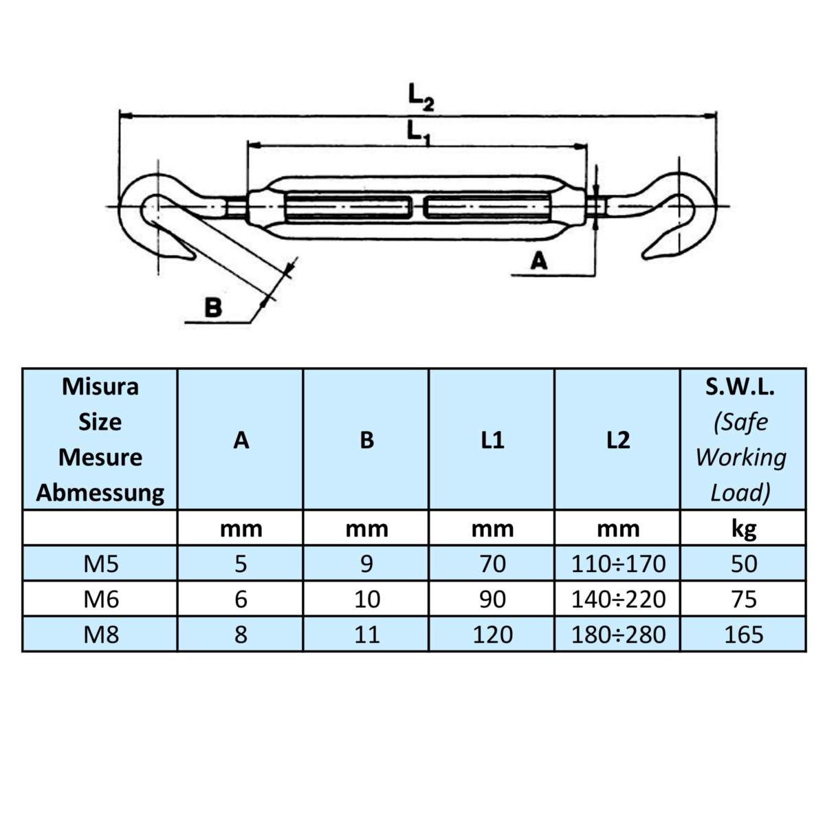 Tenditori gancio - gancio in acciaio inox AISI 316. Utili per trasmettere e regolare la tensione delle funi di acciaio che costituiscono i tiranti delle tensostrutture. Idonei anche per calibrare il tiraggio di cavetti stendibiancheria.