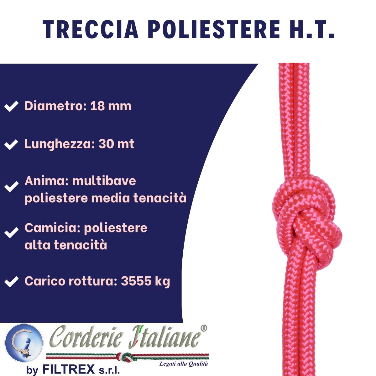 Treccia realizzata con calza in poliestere 100% alta tenacità prestirato colorato e anima in poliestere bianco. Morbida e resistente, si presta ad essere utilizzata principalmente nel settore nautico, ma trova applicazione anche nel settore edile, industriale, arredamento, per legature che richiedono una notevole forza di carico. Disponibile in diversi diametri e lunghezze, bobine con metri lineari continui e senza aggiunte. Si consiglia una saldatura a caldo dopo il taglio. Prodotto di primissima qualità e 100% Made in Italy.