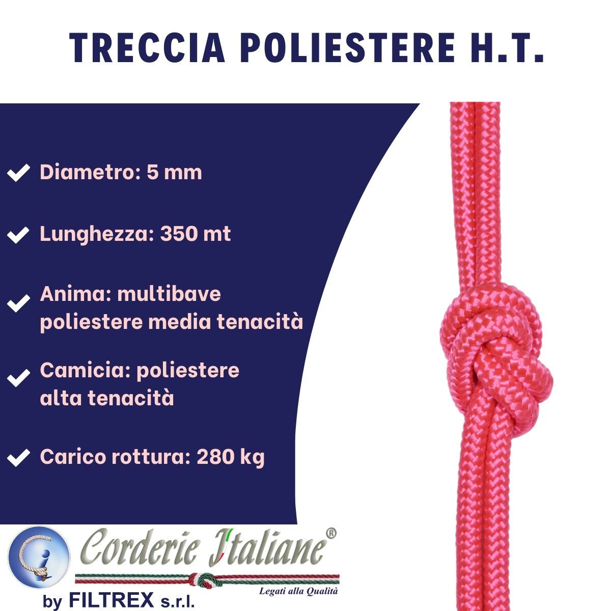 Treccia realizzata con calza in poliestere 100% alta tenacità prestirato colorato e anima in poliestere bianco. Morbida e resistente, si presta ad essere utilizzata principalmente nel settore nautico, ma trova applicazione anche nel settore edile, industriale, arredamento, per legature che richiedono una notevole forza di carico. Disponibile in diversi diametri e lunghezze, bobine con metri lineari continui e senza aggiunte. Si consiglia una saldatura a caldo dopo il taglio. Prodotto di primissima qualità e 100% Made in Italy.