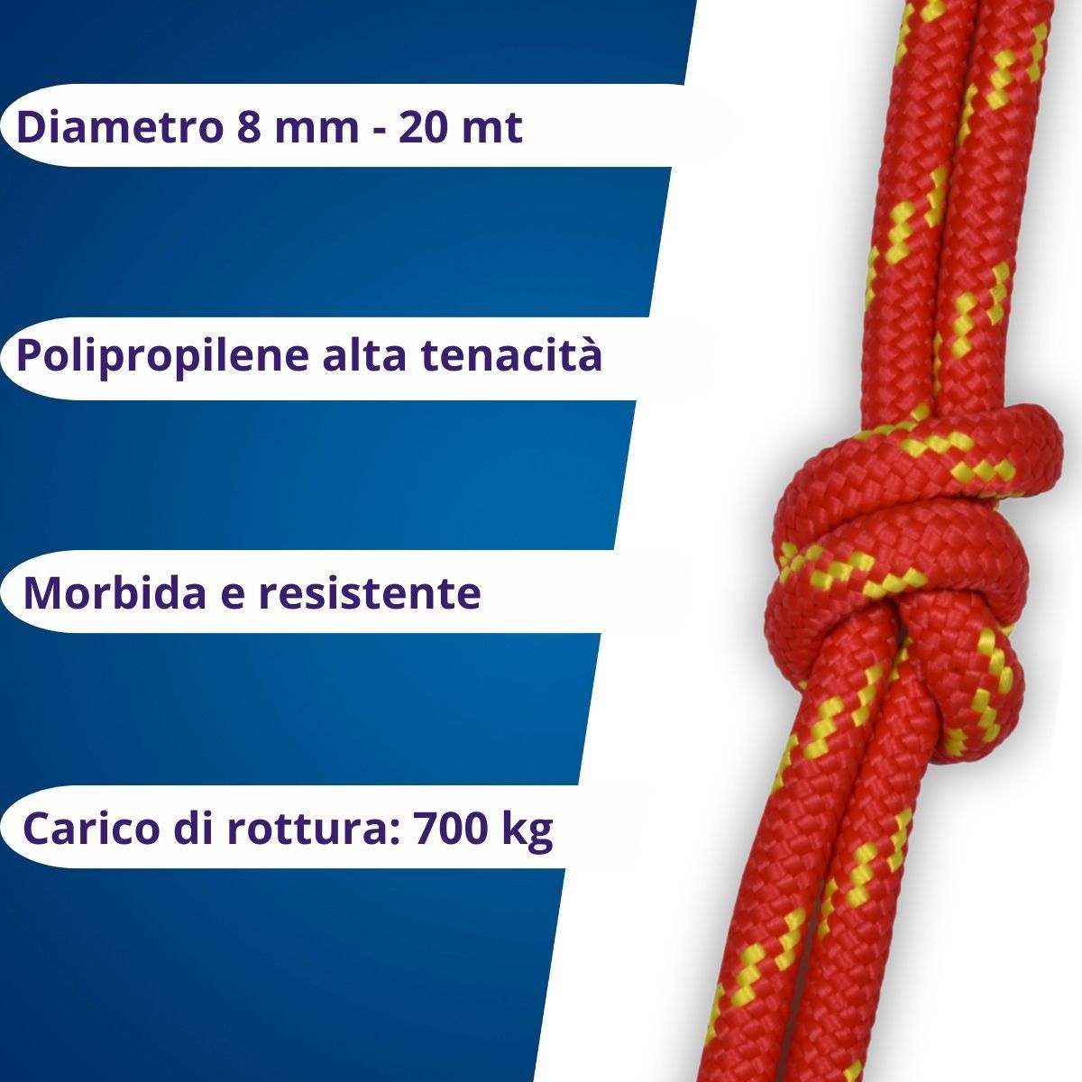 Treccia in polipropilene alta tenacità. Anima in poliestere. Morbida e resistente, si presta ad essere utilizzata principalmente nel settore nautico, ma trova applicazione anche nel settore edile, agricolo e industriale per legature che richiedono una certa forza di carico. Aspetto accattivante che la rendono idonea anche per la segnalazione di percorsi nei parchi avventura. Disponibile dal diametro 8 mm. al 14 mm., con tre spie colorate, lunghezze varie. Metri lineari continui e senza aggiunte. Si consiglia una saldatura a caldo dopo il taglio. Lavorazione a 24 fusi. Su richiesta produciamo l'articolo in diametri superiori e/o a tinta unita, senza spie colorate. Prodotto di primissima qualità e 100% Made in Italy.
