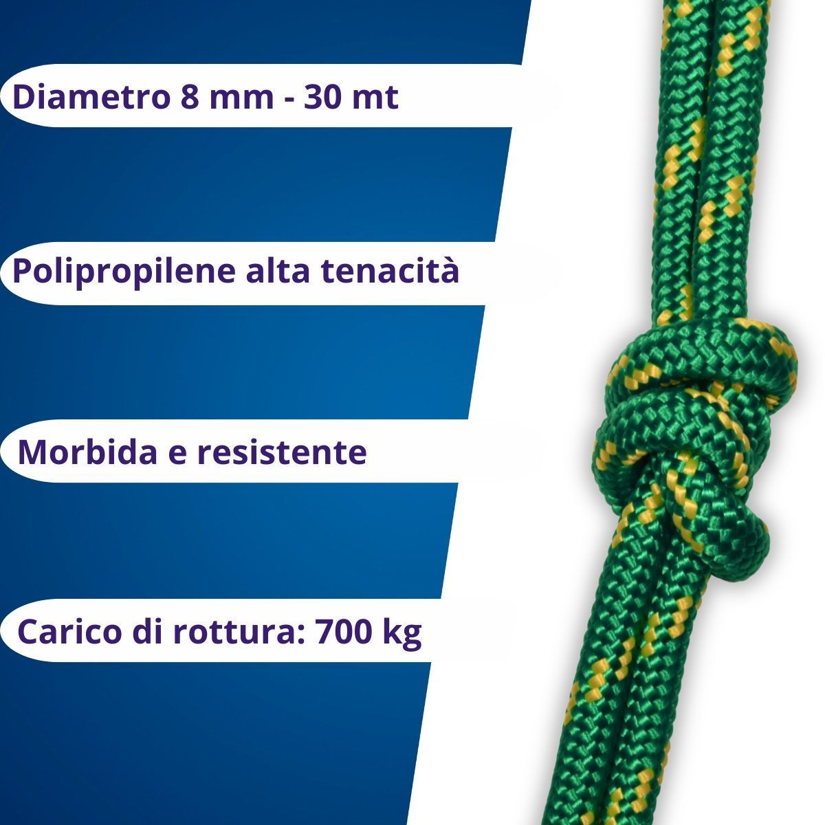 Treccia in polipropilene alta tenacità. Anima in poliestere. Morbida e resistente, si presta ad essere utilizzata principalmente nel settore nautico, ma trova applicazione anche nel settore edile, agricolo e industriale per legature che richiedono una certa forza di carico. Aspetto accattivante che la rendono idonea anche per la segnalazione di percorsi nei parchi avventura. Disponibile dal diametro 8 mm. al 14 mm., con tre spie colorate, lunghezze varie. Metri lineari continui e senza aggiunte. Si consiglia una saldatura a caldo dopo il taglio. Lavorazione a 24 fusi. Su richiesta produciamo l'articolo in diametri superiori e/o a tinta unita, senza spie colorate. Prodotto di primissima qualità e 100% Made in Italy.