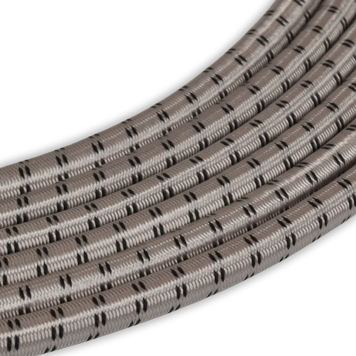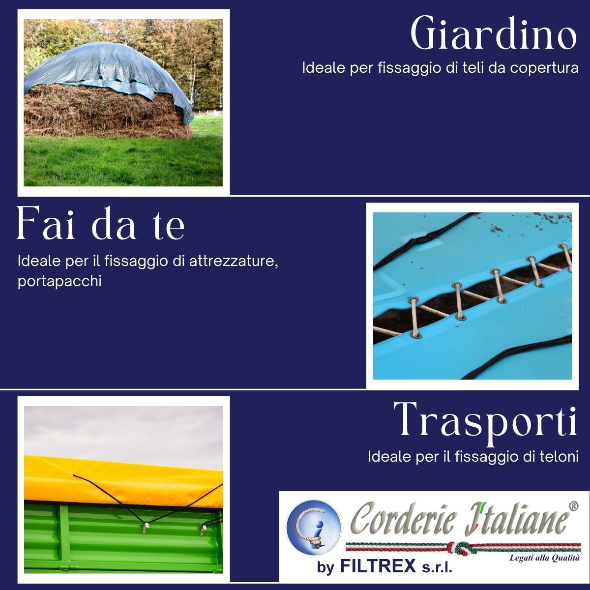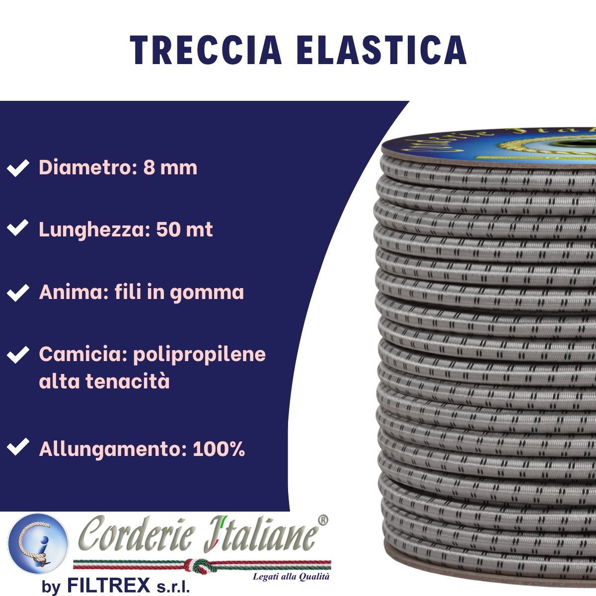Treccia elastica costituita da fili di gomma elastica e rivestimento in polipropilene stabilizzato ai raggi U.V. Morbida e resistente, si presta ad essere utilizzata per diverse applicazioni, come da fermo per pacchi da auto e moto, teloni per camion e tendostrutture in genere. Dopo il taglio, si consiglia di bruciare leggermente il solo rivestimento onde evitare sfilacciamenti.