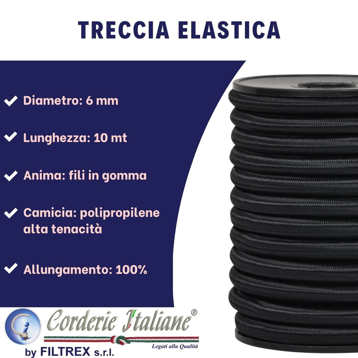 Treccia elastica costituita da anima in fili di gomma elastica e rivestimento in polipropilene stabilizzato ai raggi U.V. Morbida e resistente, si presta ad essere utilizzata per diverse applicazioni, come da fermo per pacchi da auto e moto, teloni per camion e tendostrutture in genere. Metri lineari e continui senza aggiunte. Dopo il taglio, si consiglia di bruciare leggermente il solo rivestimento onde evitare sfilacciamenti.