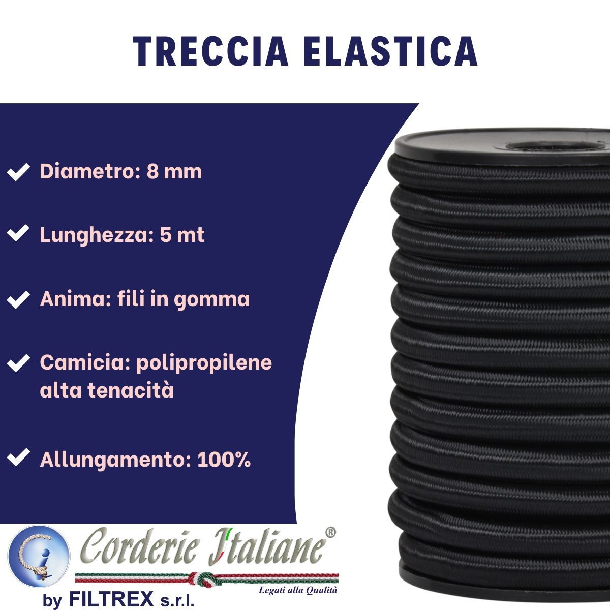 Treccia elastica costituita da fili di gomma elastica e rivestimento in polipropilene stabilizzato ai raggi U.V. Morbida e resistente, si presta ad essere utilizzata per diverse applicazioni, come da fermo per pacchi da auto e moto, teloni per camion e tendostrutture in genere. Metri lineari e continui senza aggiunte. Dopo il taglio, si consiglia di bruciare leggermente il solo rivestimento onde evitare sfilacciamenti.