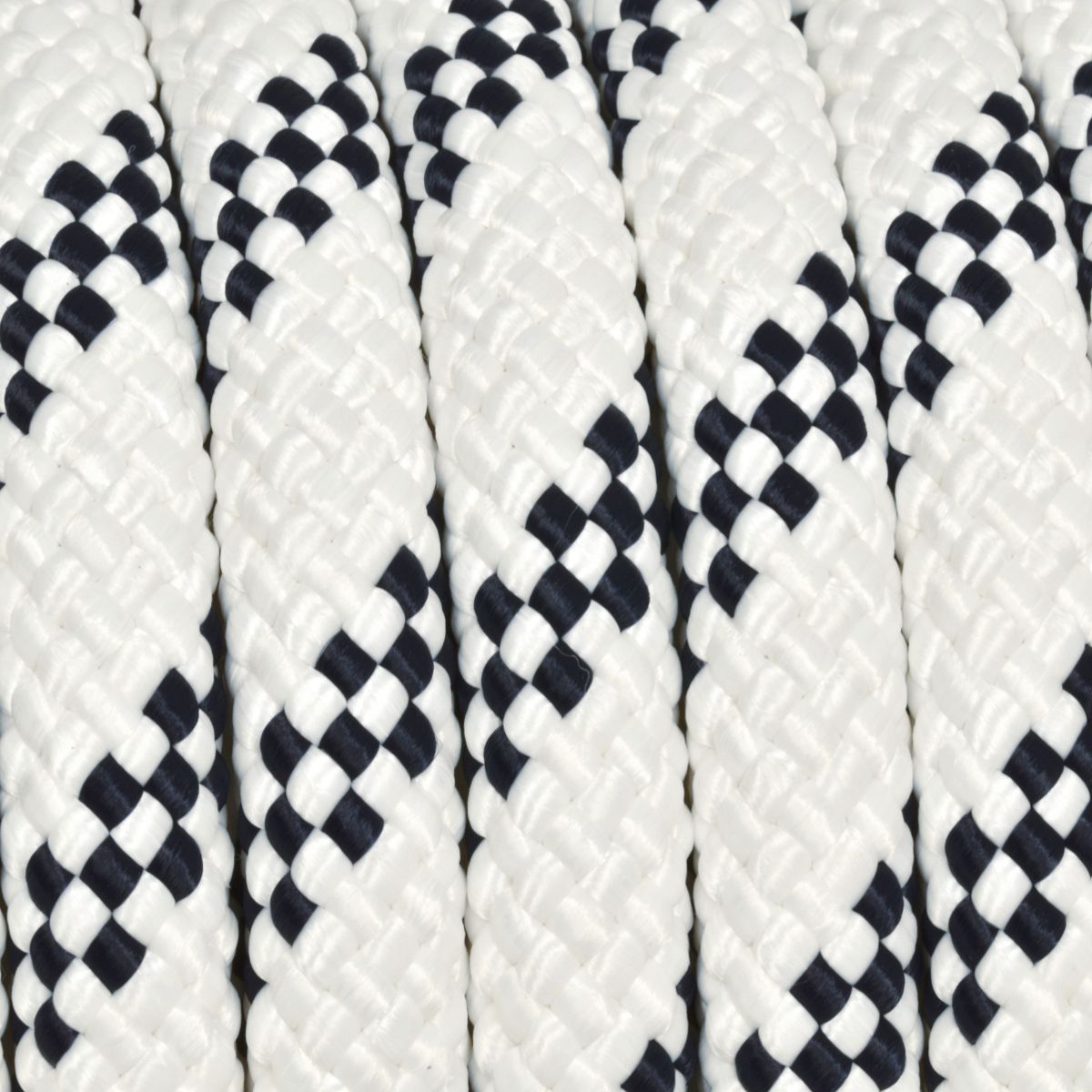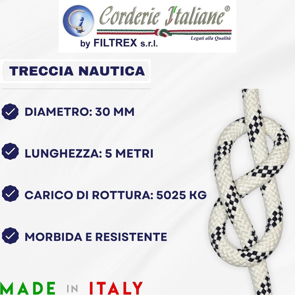 Treccia nautica realizzata in poliestere bianco e segnalino blu stabilizzati. Anima costituita da multifilamenti ritorti in poliestere. Morbida, resistente e affondante, viene utilizzata principalmente nel settore nautico come cima da ancoraggio, ormeggio, per il fissaggio dei corpi morti alla boa o anche come tientibene su gommoni e candelieri. Rispetto ad altre fibre sintetiche, il poliestere si asciuga rapidamente e resta morbido anche dopo lunghe immersioni in acqua dolce o salata. Presenta inoltre una forte resistenza allo strappo e all'abrasione. Queste caratteristiche la rendono idonea anche per il settore edile, agricolo e industriale per applicazioni che richiedono importanti forze di carico. Disponibile in diversi diametri e lunghezze, bobina e blister con metri lineari continui e senza aggiunte. Si consiglia una saldatura a caldo dopo il taglio. Prodotto di primissima qualità e 100% Made in Italy.