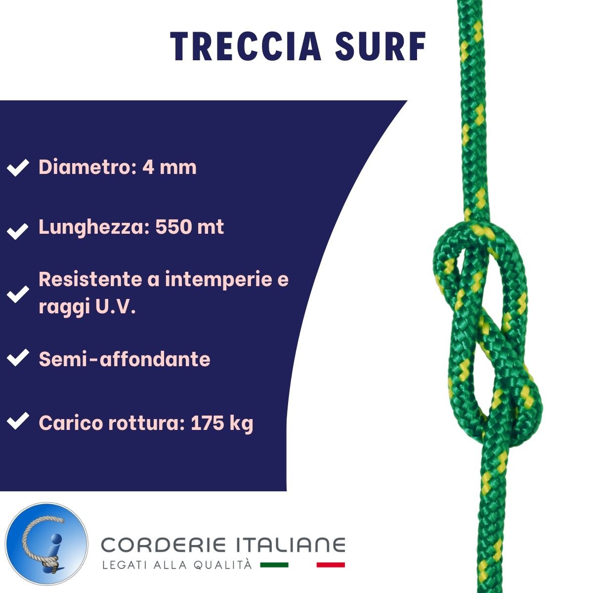 Treccia realizzata con filati 100% polipropilene alta tenacità stabilizzato ai raggi UV, colore verde con spia gialla. Si caratterizza per: